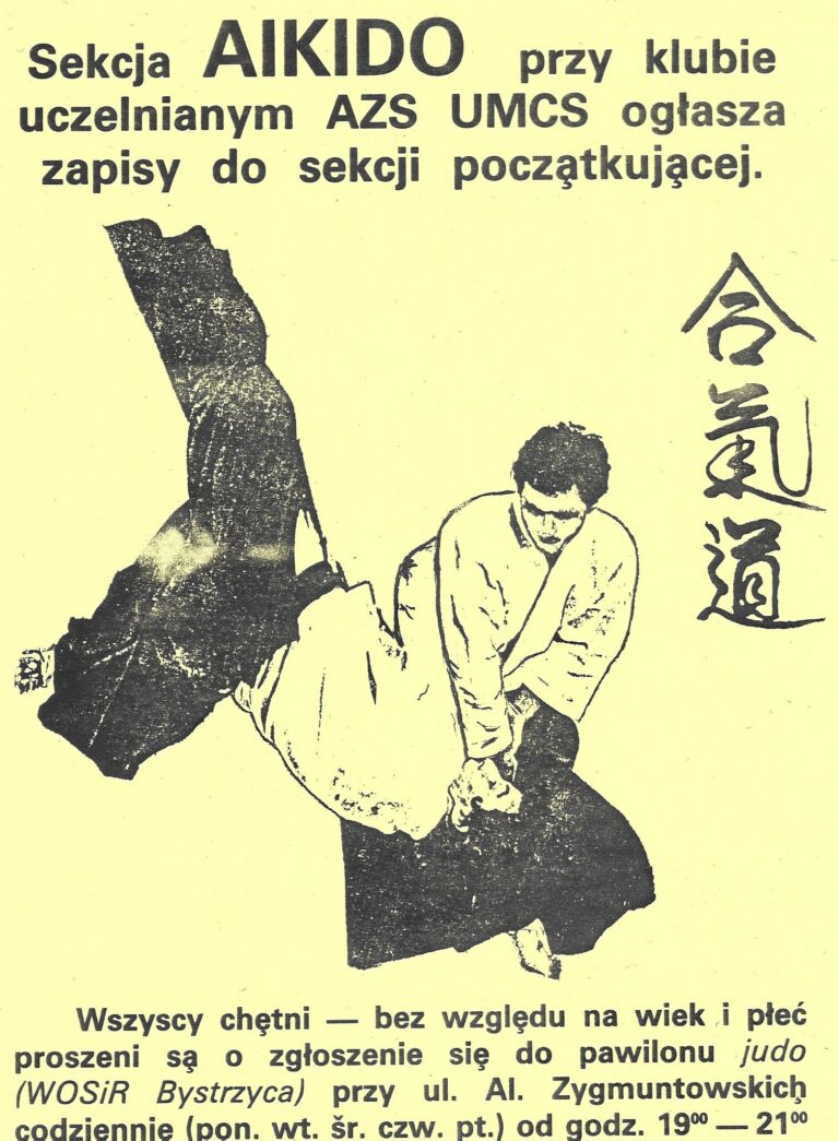 Początki aikido w Lublinie sięgają 1985 roku. 16-go lutego 1985 roku odbyło się w Lublinie pierwsze seminarium aikido prowadzone przez Czesława Poczykowskiego Sensei. Został on zaproszony do Lublina przez dwóch pasjonatów sztuk walki Janusza Malca i Bogdana Proca, którzy uprawiali karate kyokushinkai. Niewątpliwie to wydarzenie możemy przyjąć za początki aikido w Lublinie. Nadmienić należy, że Czesław Poczykowski był w grupie pierwszych 8 osób w Polsce, które otrzymały w 1986 roku I dan aikido. Godne uwagi jest to, że stopnie te nadał Polakom Japończyk Sensei Toshikazu Ichimura. Sensei Ichimura propagował w tamtym czasie aikido w Skandynawii i posiadał 6 dan. Rok wcześniej z inicjatywy lubelskich taekwondeków były podejmowane próby zaszczepienia aikido w naszym mieście przez Jacka Wysockiego Sensei pochodzącego ze Szczecina. Zajęcia odbywały się sporadycznie w Szkole Podstawowej nr 33 przy ul. Pogodnej. Jednak ze względu na dużą odległość zamieszkiwania Jacka Wysockiego i w wyniku braku wyszkolonych instruktorów w Lublinie idea ta szybko upadła. Dopiero zaangażowanie Senseia Czesława Poczykowskiego, który zamieszkał w 1985 roku w Lublinie, doprowadziło do postania pierwszej formalnej organizacji aikido w Lublinie. Zaczęliśmy trenować w ramach sekcji Klubu Uczelnianego AZS UMCS w pawilonie sportów walki MOSIR przy Al. Zygmuntowskich. W tym też roku treningi aikido rozpoczął Mirosław Przybylski. Senesei Czesław Poczykowski nauczał aikido w Lublinie przez rok i pod koniec 1986 roku wyjechał z Lublina. Jego misję kontynuował Jerzy Gorzeń, który został „namaszczony” do prowadzenia treningów przez Sensei Poczykowskiego jako wyróżniający się uczeń. Pomagał mu w tym czasie Mirosław Przybylski. W 1987 roku Mirosław Przybylski wraz z Jerzym Gorzeniem jako pierwsi aikidocy z Lublina uczestniczyli w kursie instruktorów aikido w Nowym Targu.